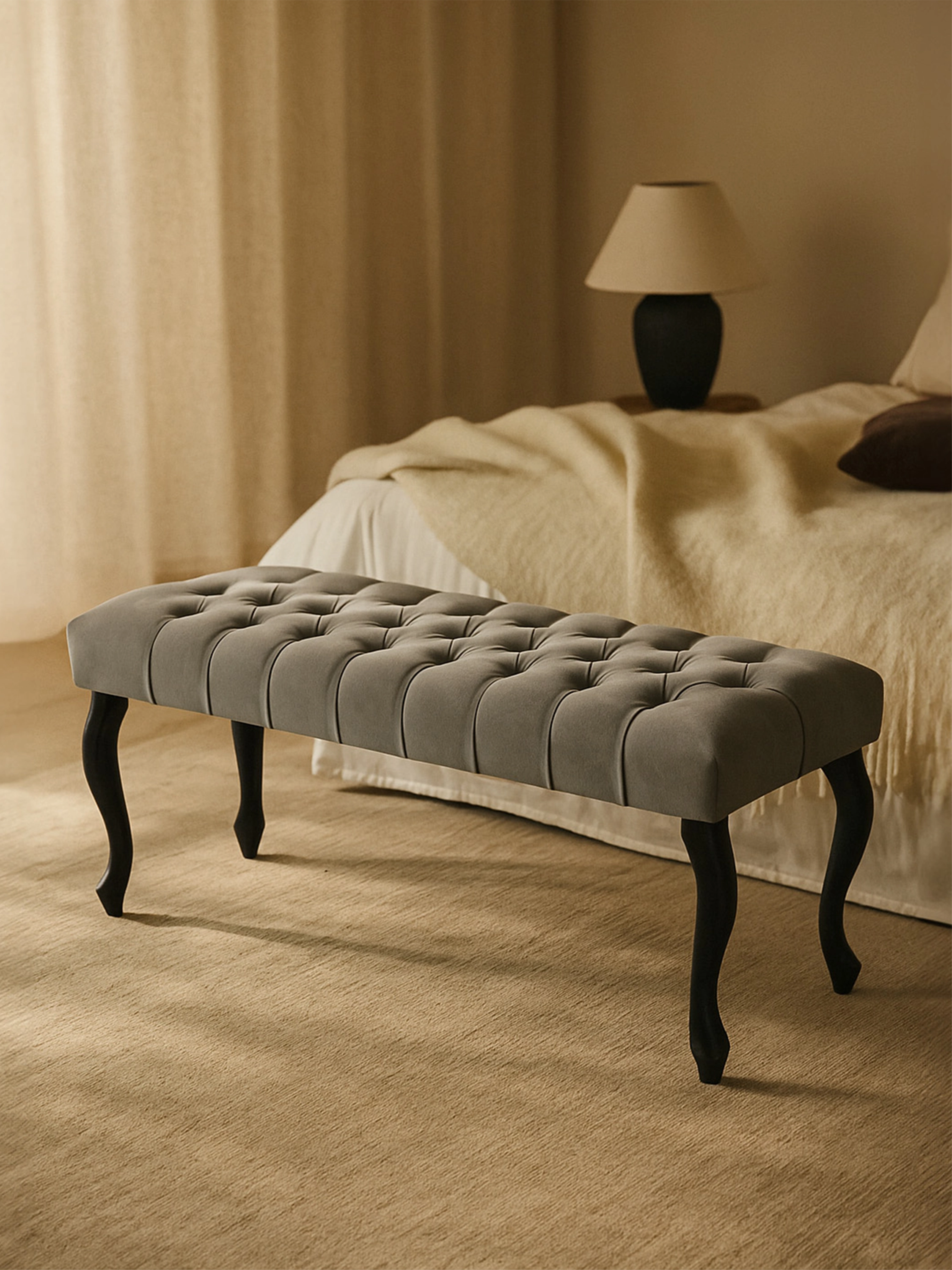 La panca Chesterfield fatta a mano in stile classico presenta una seduta trapuntata e spessa, rivestita con materiali di alta qualità. Le gambe in legno di faggio ne garantiscono la resistenza e la stabilità. Con questa panca da ingresso infilare le scarpe diventerà un piacere, mentre sulla panca da camera da letto si possono sistemare i cuscini o un copriletto. Personalizza la tua panca e adattala perfettamente al tuo arredamento. Scegli il colore e la collezione del tessuto e, soprattutto, decidi delle dimensioni le più adatte alla tua casa!