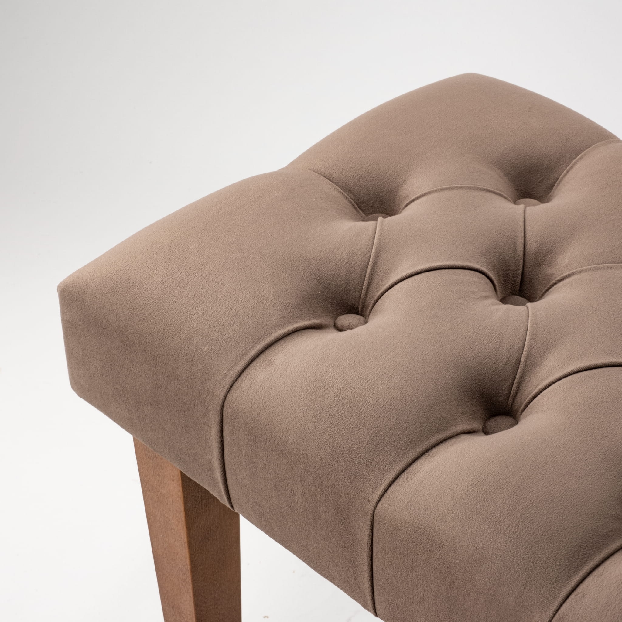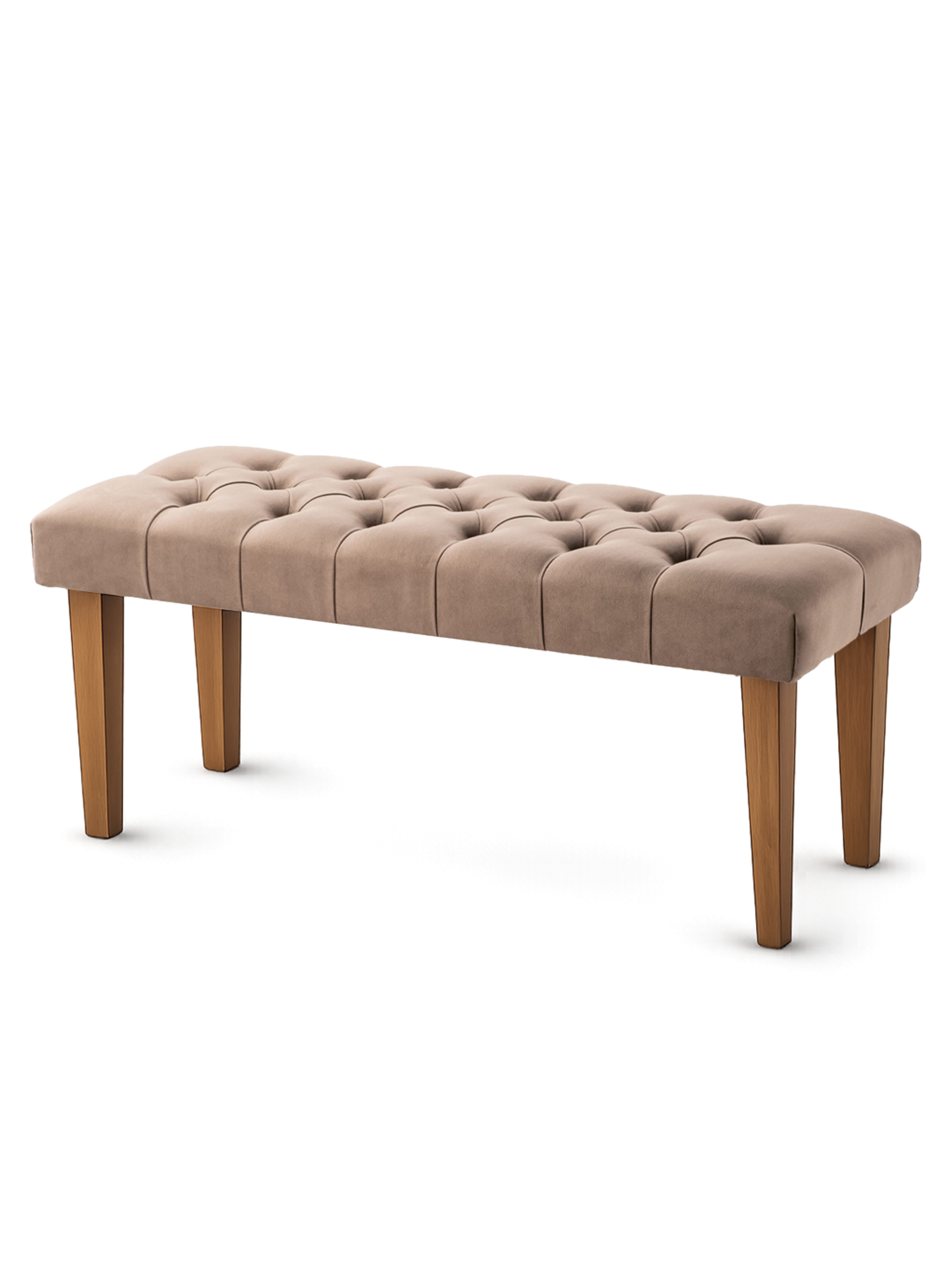 Panca da corridoio trapuntata in beige pietra su solide gambe dritte. La seduta è interamente realizzata a mano, per questo ha un aspetto così bello e durerà per molti anni. Il tessuto utilizzato per rifinire la panca è resistente all'abrasione, alle macchie e alla luce del sole. Le gambe sono realizzate in legno di faggio di classe A, lavorate a mano e verniciate a spruzzo con una vernice resistente alle schegge.