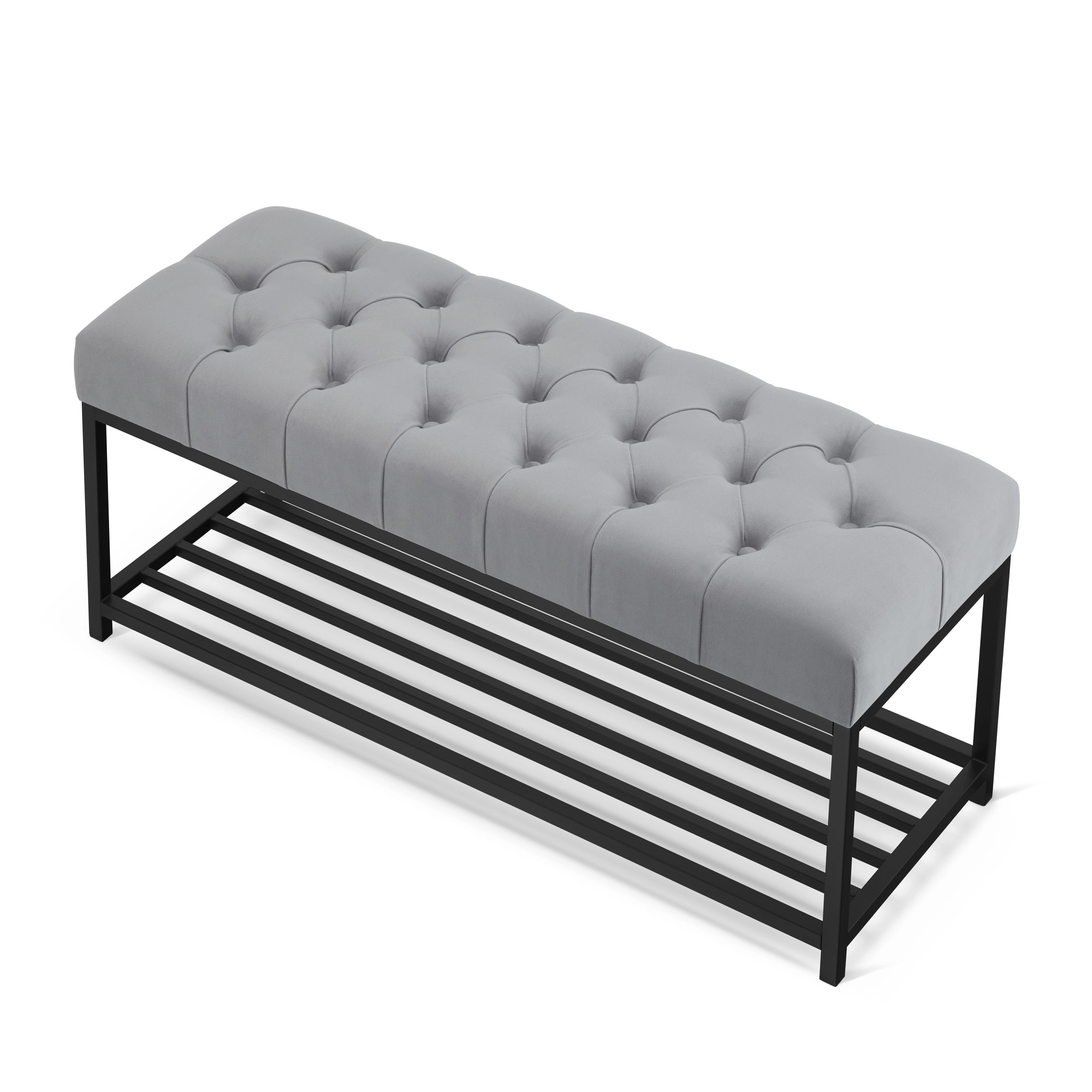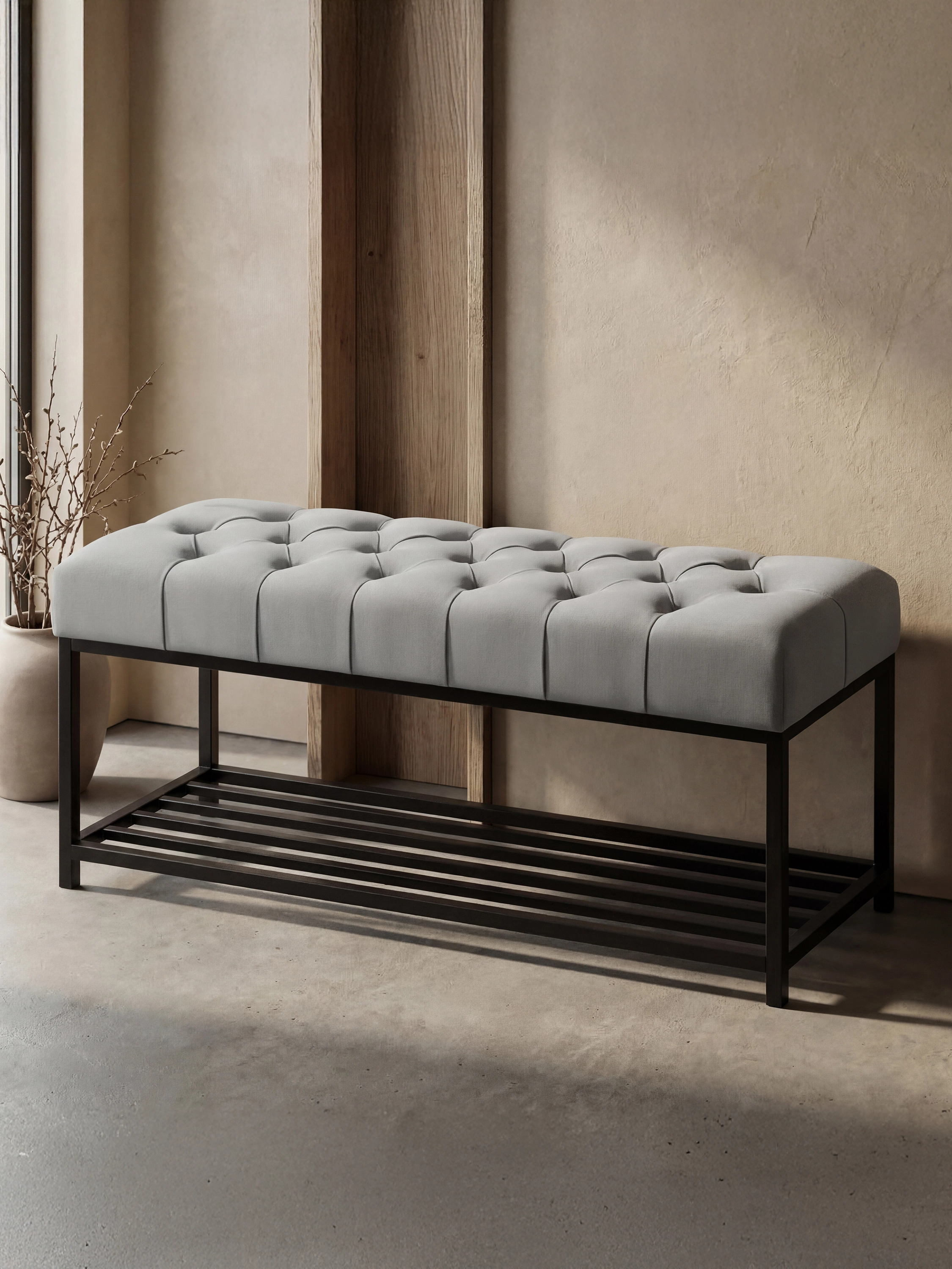 Una panca con ripiano per le scarpe e seduta trapuntata, che unisce la funzionalità a un design più raffinato. Il pratico ripiano aiuta a tenere in ordine le scarpe, mentre la morbida seduta trapuntata aumenta il comfort. È perfetta per l'ingresso, il guardaroba o la camera da letto, adattandosi a diversi ambienti.