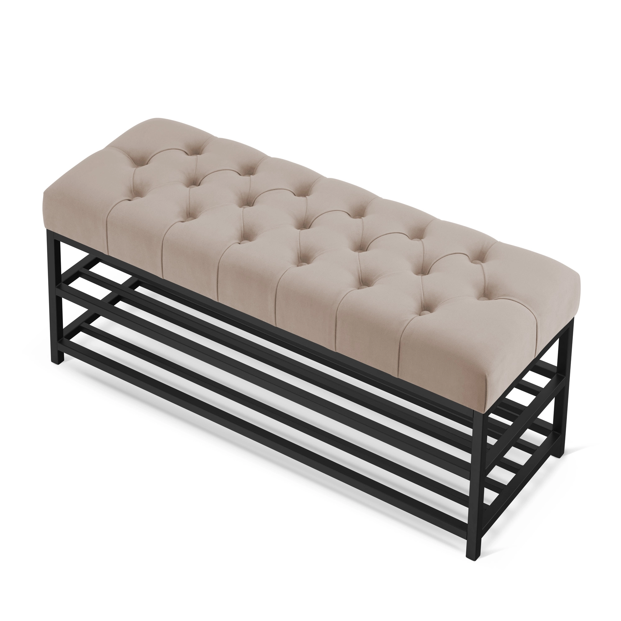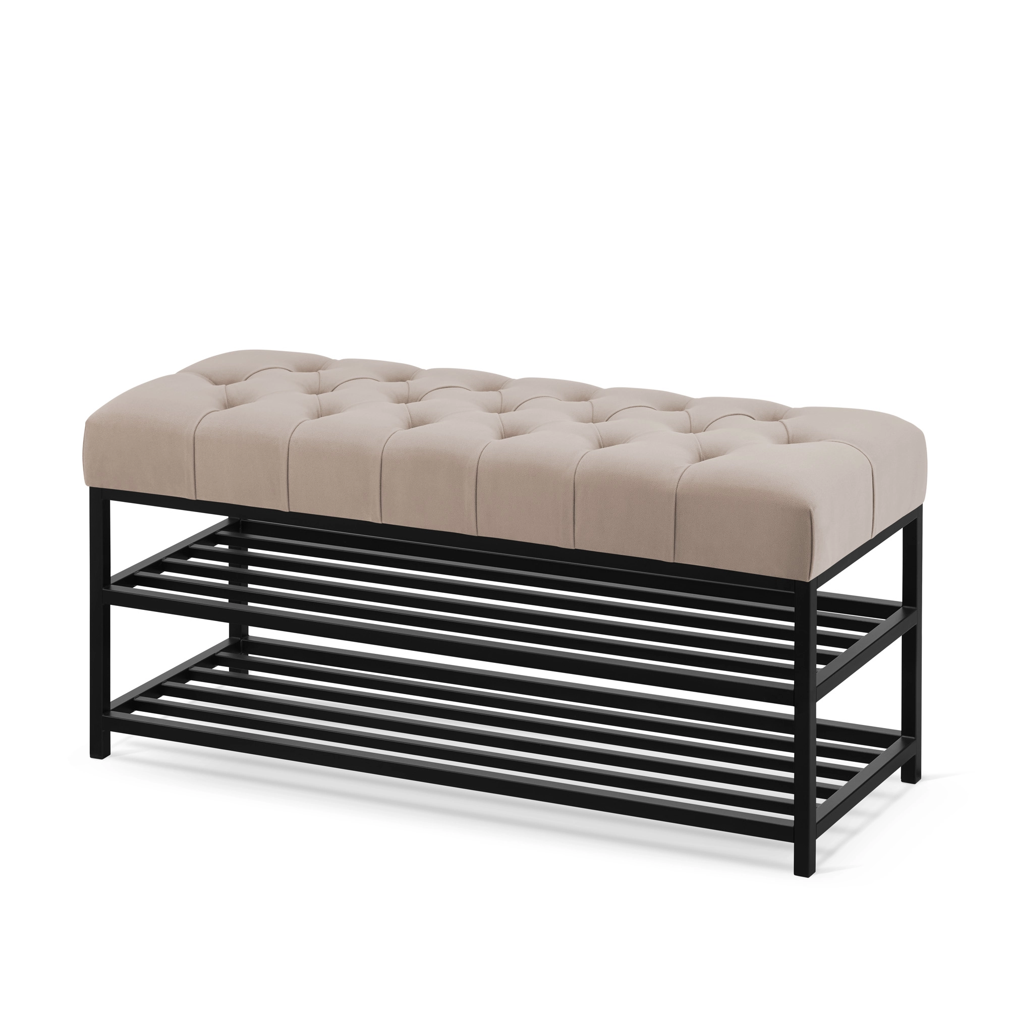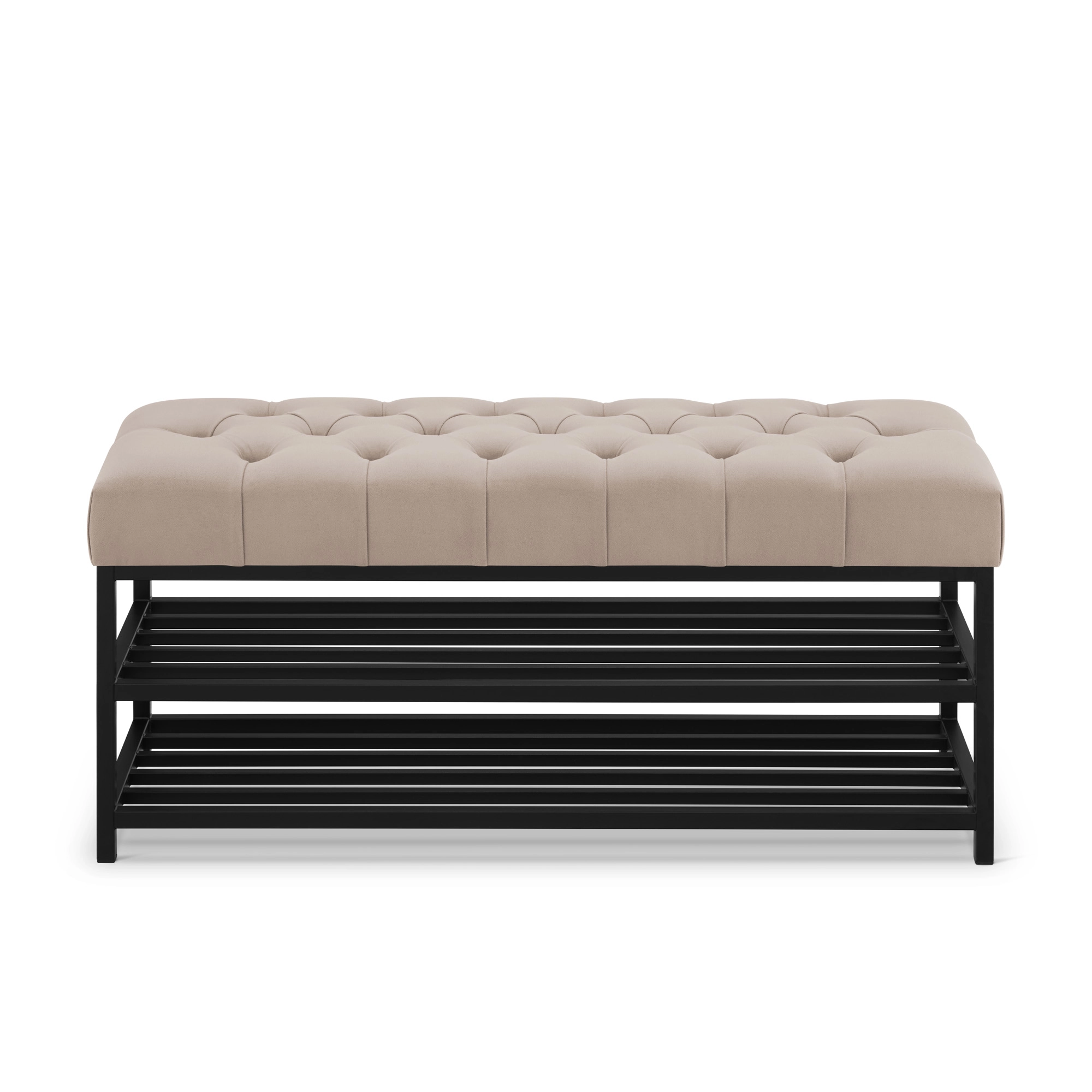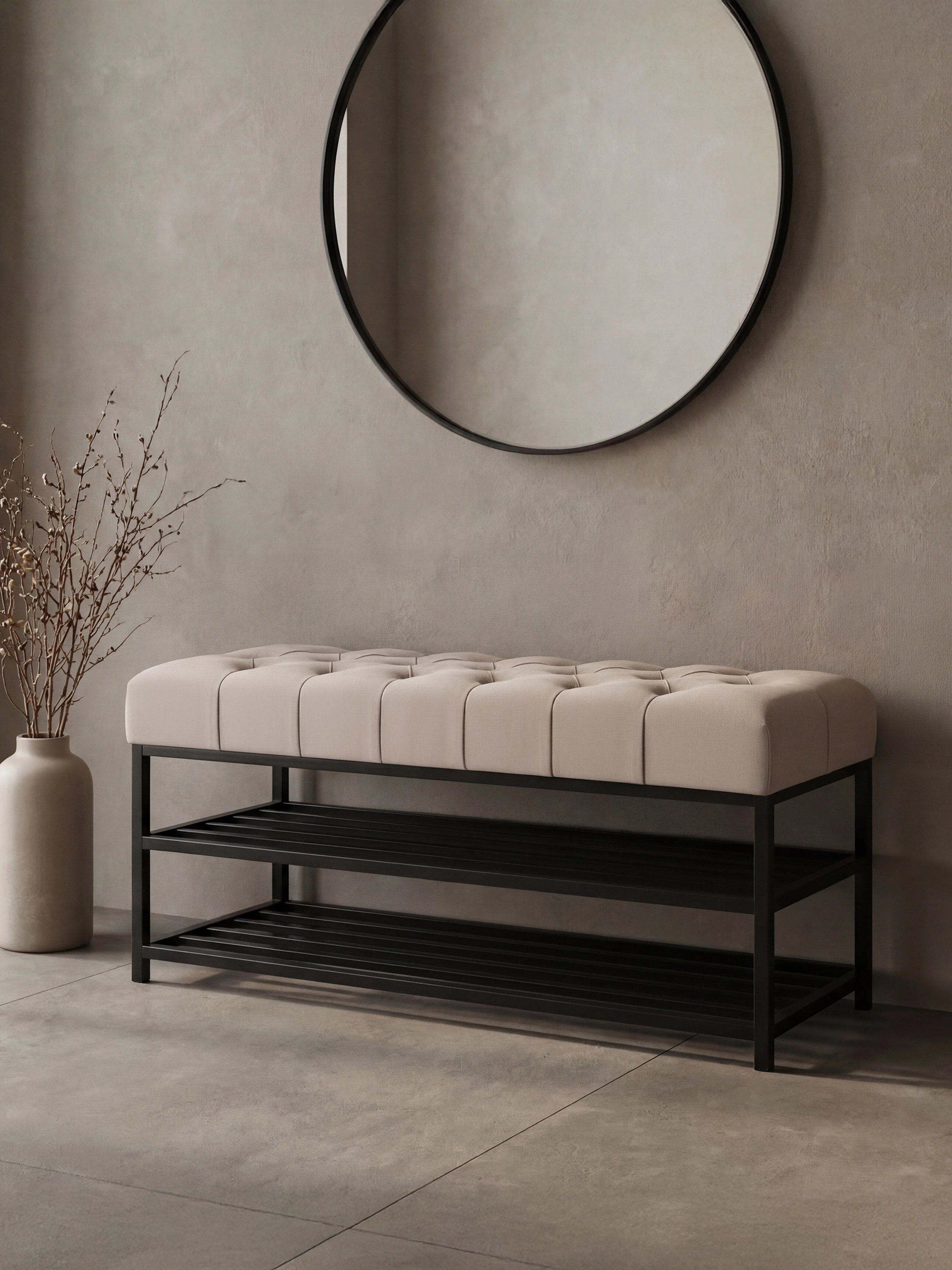 Una panca con due ripiani e una marcata trapuntatura che le conferisce un aspetto più elegante e raffinato. I due ripiani consentono di tenere in ordine le scarpe, mentre la morbida seduta garantisce comfort quotidiano. È perfetta per l'ingresso, il guardaroba o la camera da letto, adattandosi a diversi ambienti.