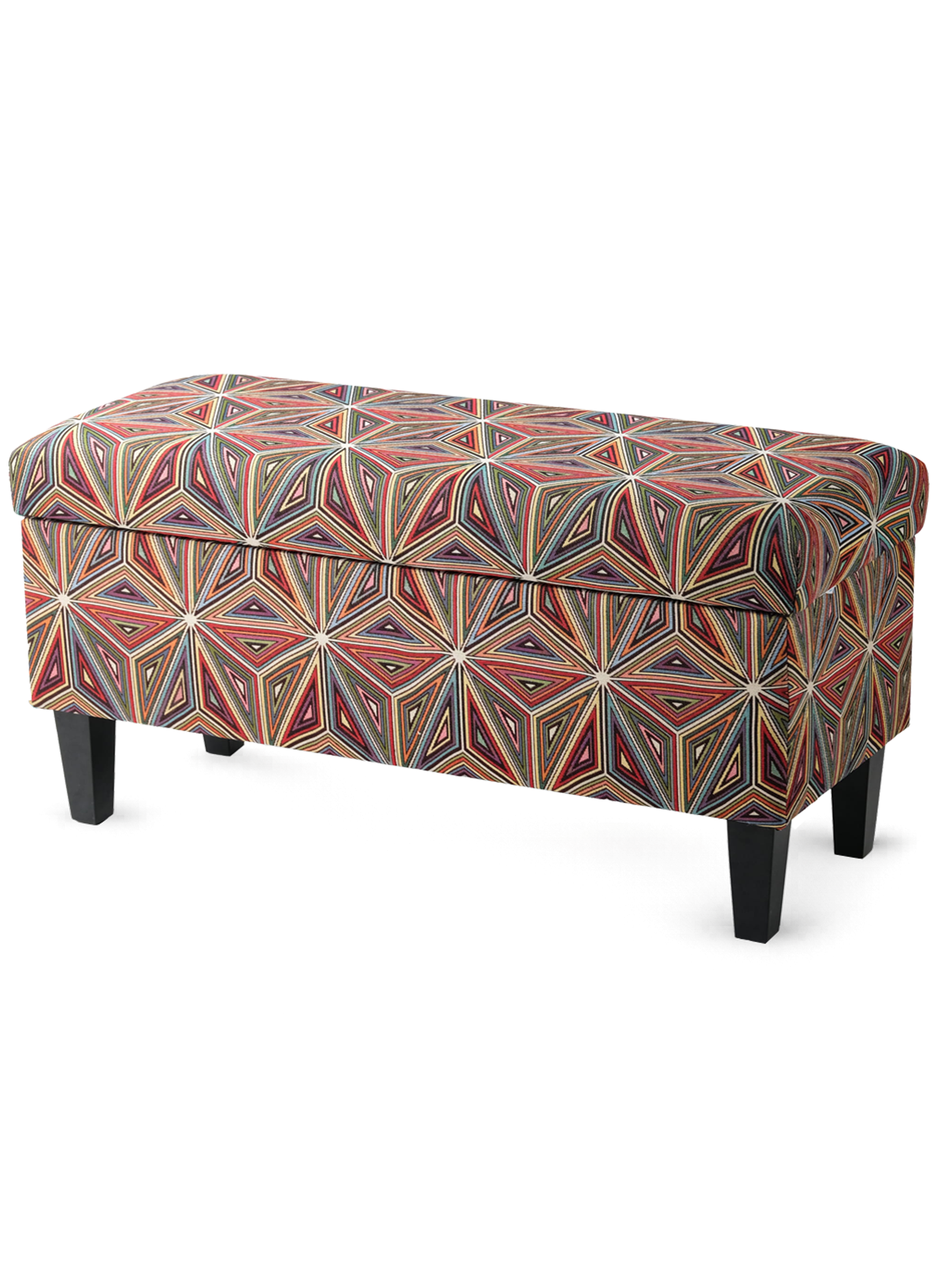 Il tessuto Fibero a fantasia si è guadagnato la sua popolarità grazie a motivi geometrici in colori sorprendenti. I tessuti sono molto resistenti alle macchie, all'abrasione e alla luce del sole. Il pouf con apertura a pedale è imbottito e realizzato interamente a mano. La seduta è imbottita di schiuma anallergica e di ovatta. Si apre con cerniere a molla silenziose. Le gambe della panca sono realizzate in legno di faggio di classe A.