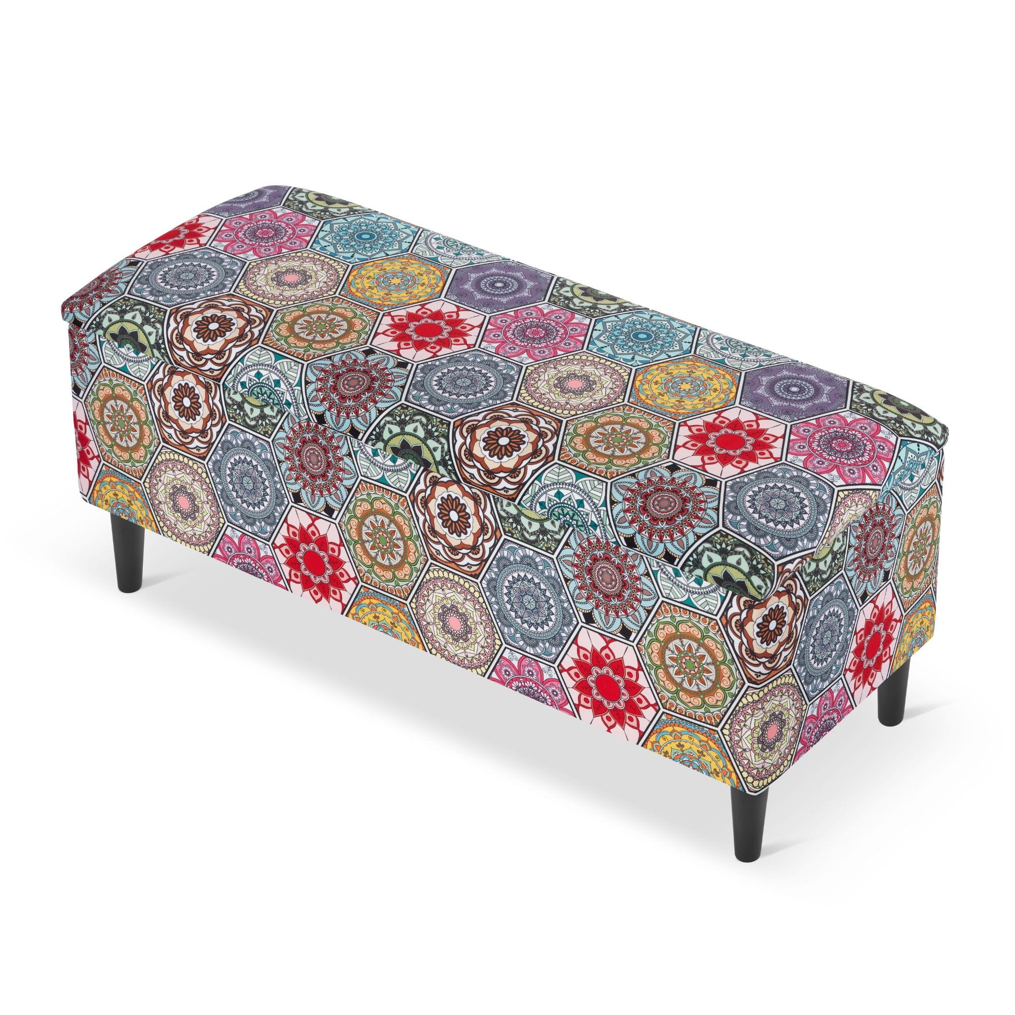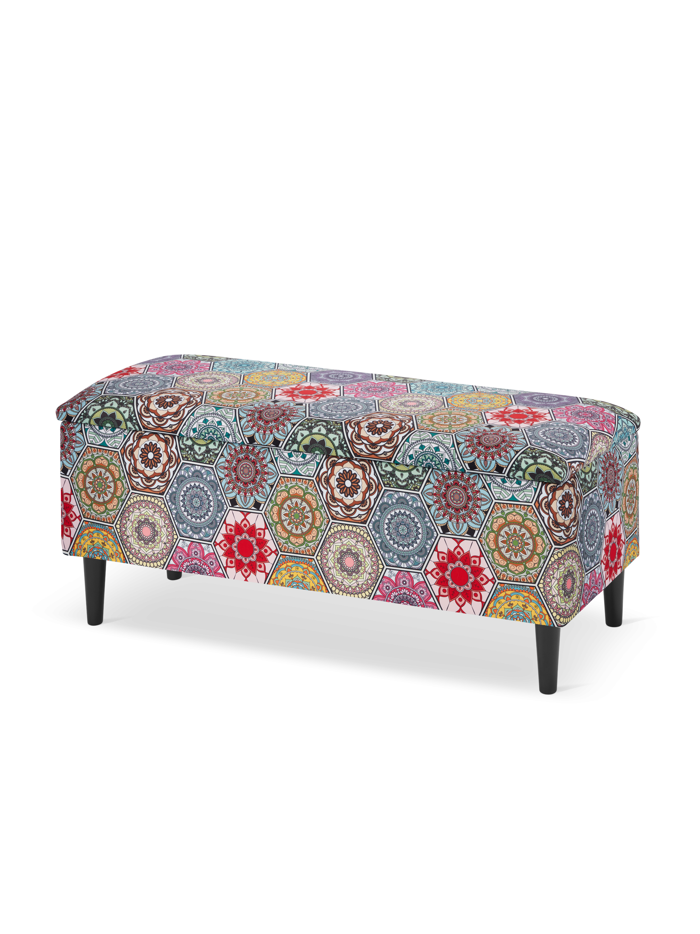 I motivi orientali della rivestitura conferiscono al poggiapiedi un carattere unico e un fascino esotico, creando un'atmosfera di mistero e apportando un tocco di esotismo o stile boho all'ambiente. Oltre alla sua estetica, il poggiapiedi con vano portaoggetti offre numerosi vantaggi pratici. Grazie allo spazio interno per riporre oggetti, è possibile conservare vari articoli come coperte, cuscini, riviste o giocattoli.