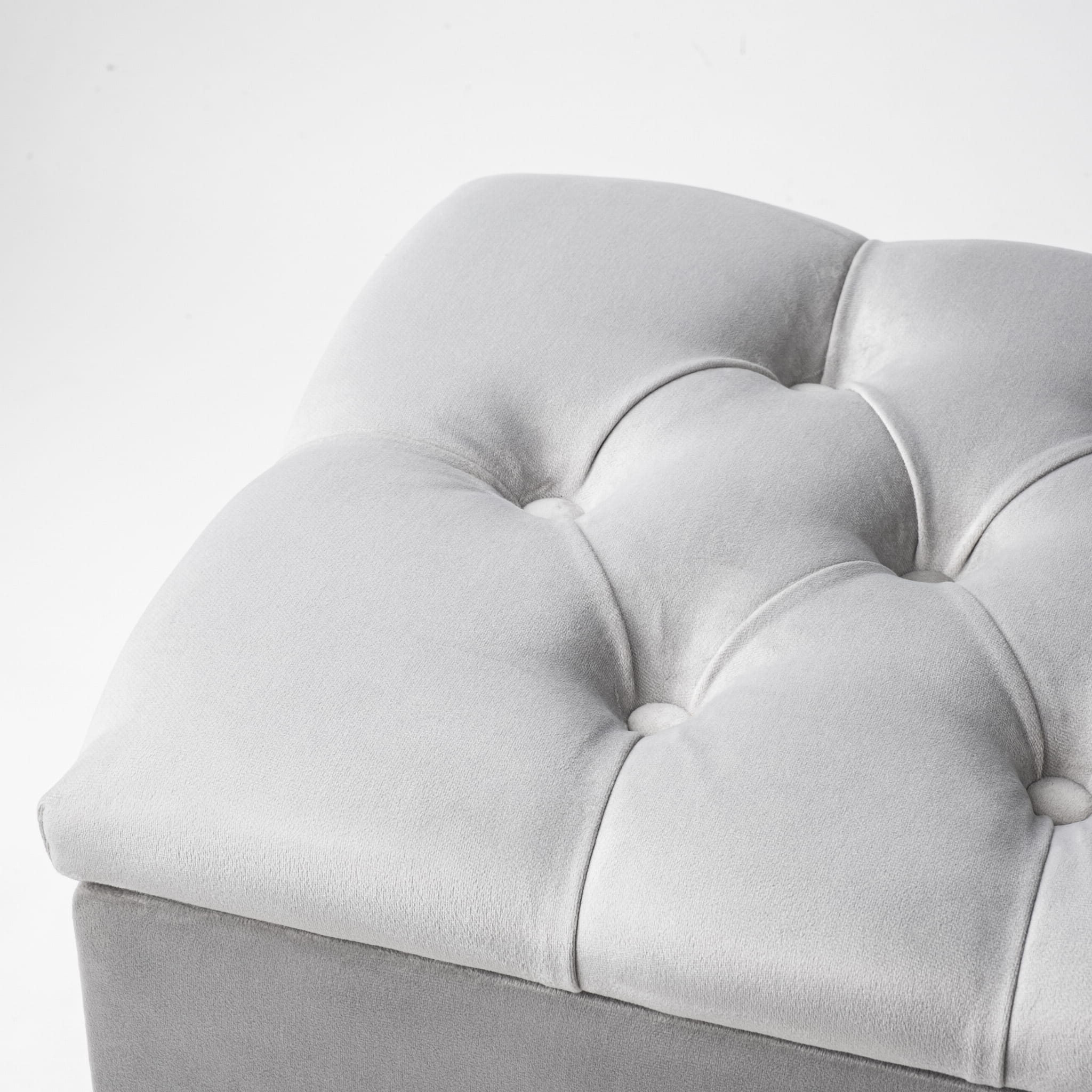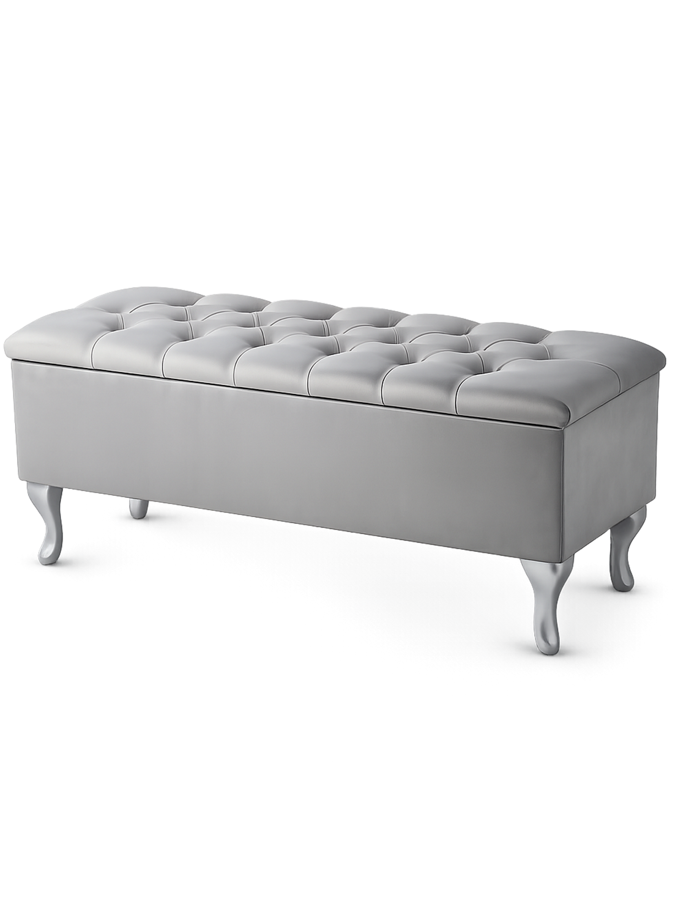 Il colore grigio luminoso e scintillante del tessuto è accostato alle gambe color argento. Una composizione di questo tipo è sicuramente uno stile elegante. Il bagagliaio di questa panca è alto e capiente. L'intera unità si apre con cerniere a molla, impercettibili. La seduta è elastica grazie alla schiuma e all'ovatta ipoallergenica e densa dell'imbottitura. I lati della scatola sono imbottiti di spugna e il tutto è rivestito con tessuto certificato Oeko-Tex. Le gambe della panca sono realizzate in legno di faggio di classe A, lavorate a mano e verniciate a spruzzo con una vernice resistente alle schegge.