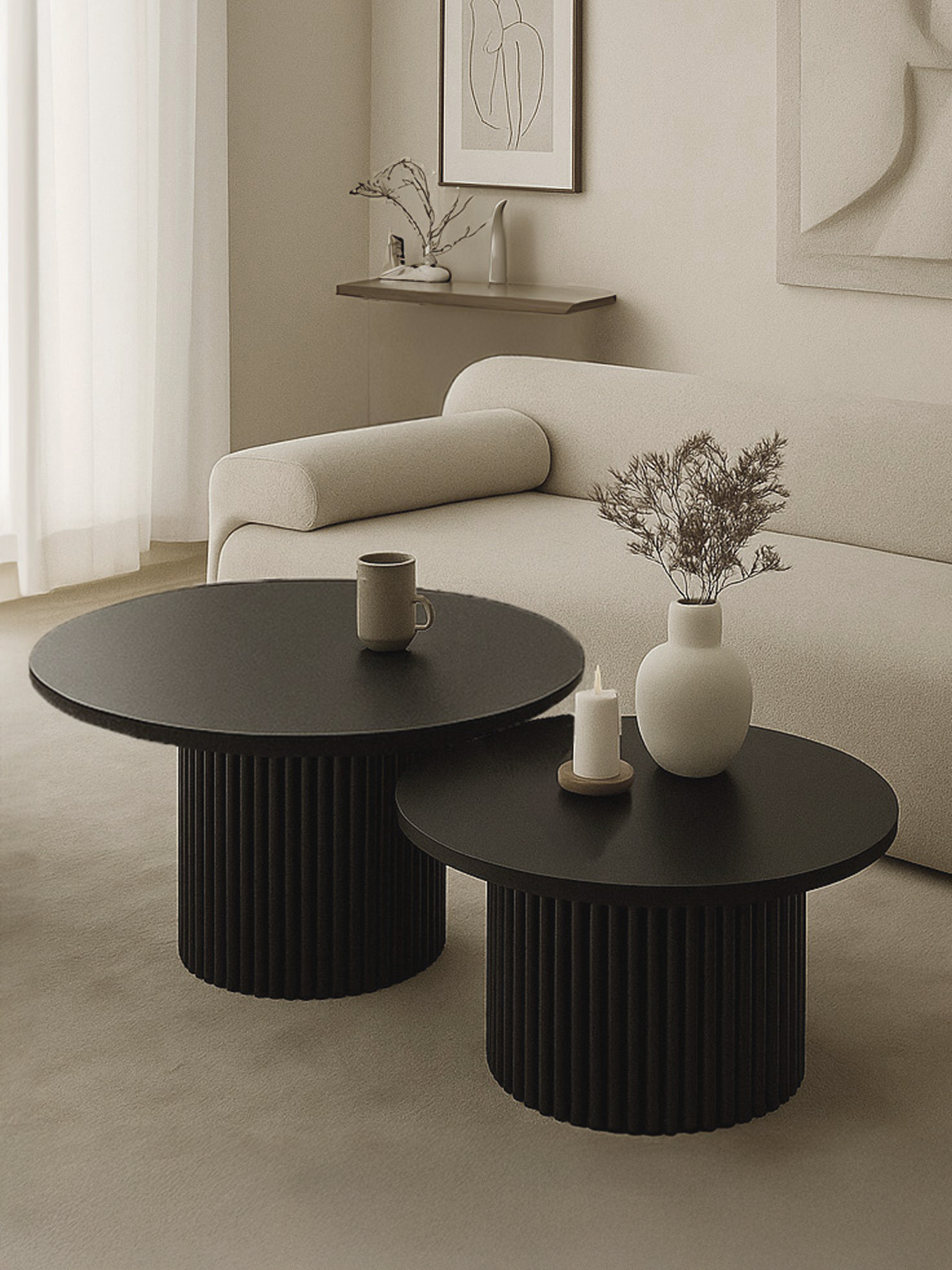 Esclusivi tavolini da caffè con piano rotondo e gamba scanalata disponibili in diverse dimensioni e colori, possono trovare posto in soggiorno, camera da letto e persino in bagno e servire come tavolini d'appoggio o supporti per i fiori.