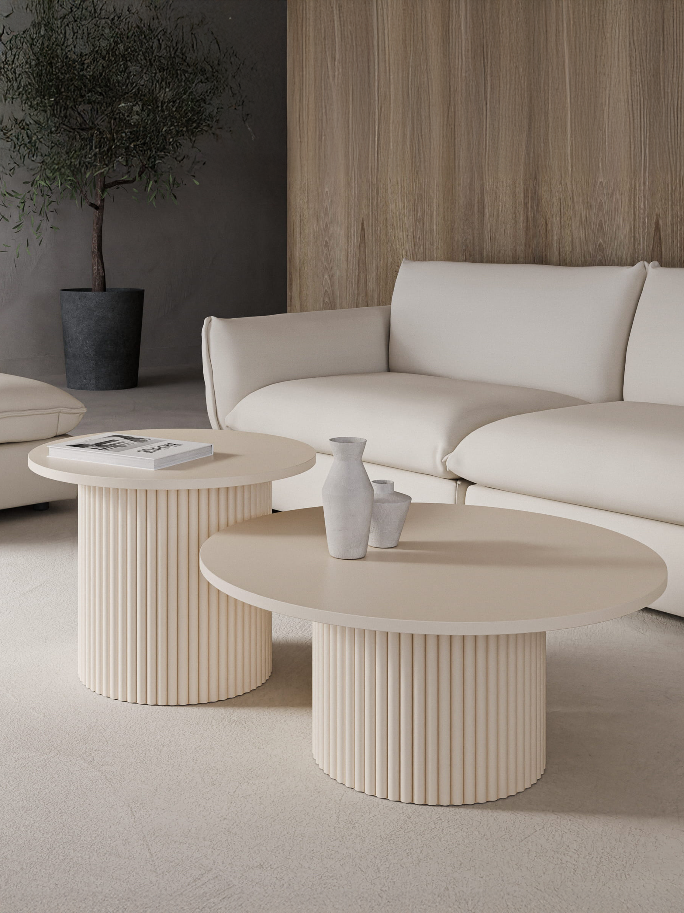 Esclusivi tavolini da caffè con piano rotondo e gamba scanalata disponibili in diverse dimensioni e colori, possono trovare posto in soggiorno, camera da letto e persino in bagno e servire come tavolini d'appoggio o supporti per i fiori.